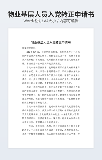 【特殊限制】设计师仅对作品中独创性部分享有著作权,对作品中含有的国旗、国徽等政治图案不享有权利,仅作为作品整体效果的示例展示,禁止商用。 相关关键词: 预备党员 转正 转正申请 申请书