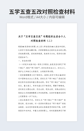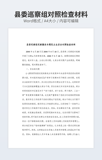 本作品内容为专题组织生活会党员对照检查下载,大小为19.64KB,作品为高清大图模板,格式为docx, 属于对照检查模板,作品模板源文件下载后可用编辑替换,模板中如有人物画像仅供参考禁止商用。小Q办公网-提供简历,PPT,Word,Excel优质模板素材下载模版平台,拥有海量的工作总结、竞聘求职、年终颁奖、计划书等。 通过小Q办公网下载对照检查模板源文件编辑修改源文件文字和图片即可使用。