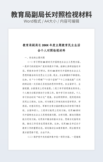 本作品内容为基层以案促改个人对照材料下载,大小为19.33KB,作品为高清大图模板,格式为docx, 属于对照检查模板,作品模板源文件下载后可用编辑替换,模板中如有人物画像仅供参考禁止商用。小Q办公网-提供简历,PPT,Word,Excel优质模板素材下载模版平台,拥有海量的工作总结、竞聘求职、年终颁奖、计划书等。 通过小Q办公网下载对照检查模板源文件编辑修改源文件文字和图片即可使用。