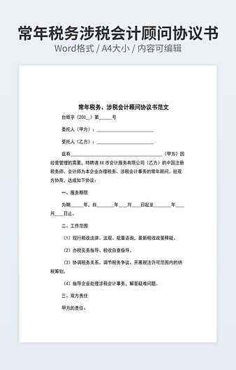 【特殊限制】设计师仅对作品中独创性部分享有著作权,对作品中含有的国旗、国徽等政治图案不享有权利,仅作为作品整体效果的示例展示,禁止商用。 相关关键词: 税务代理 委托书