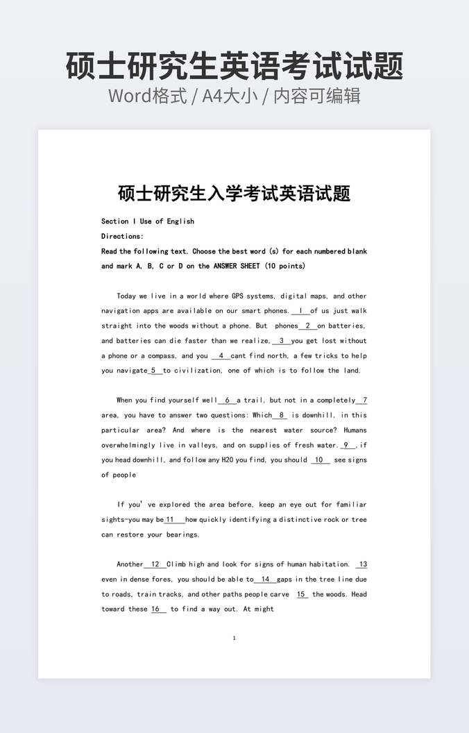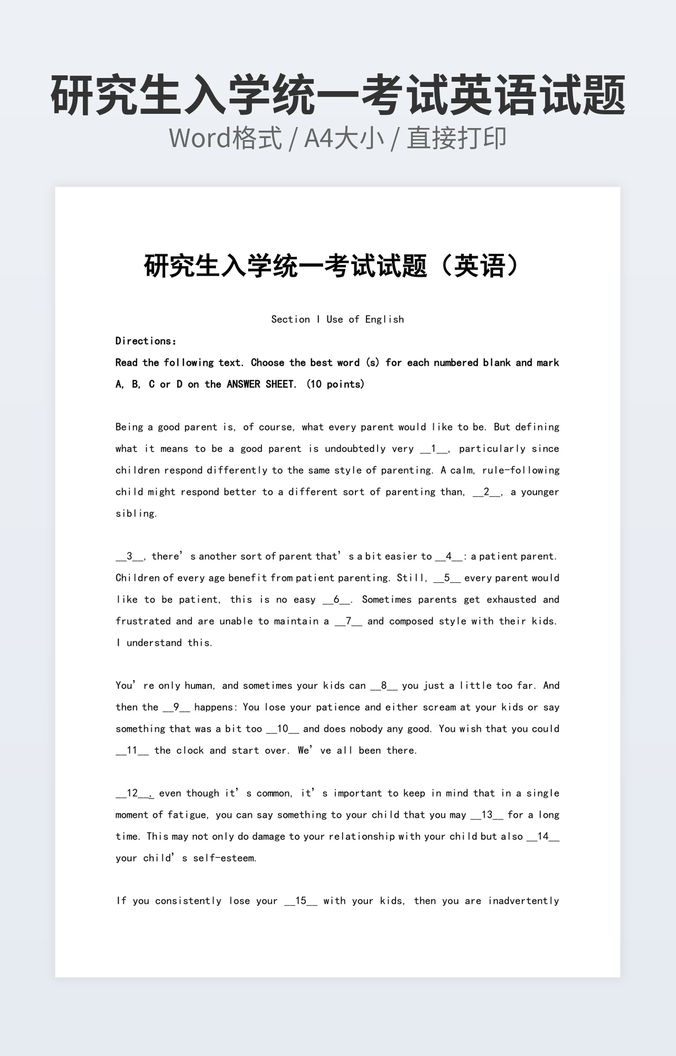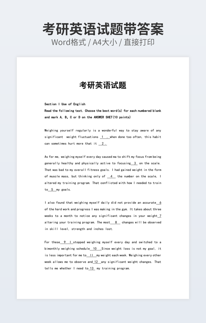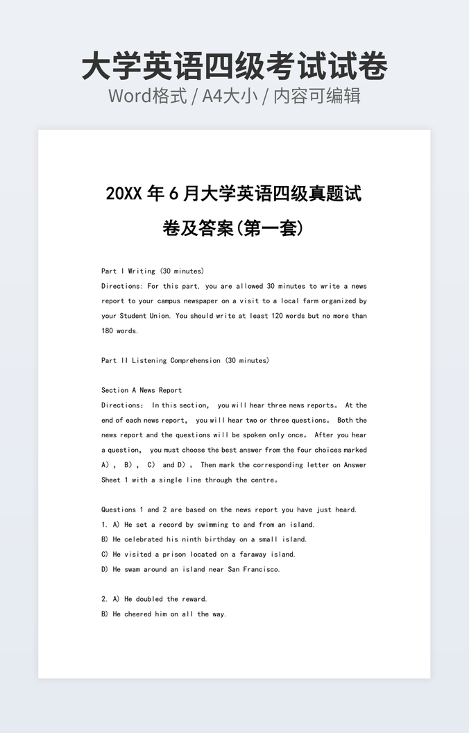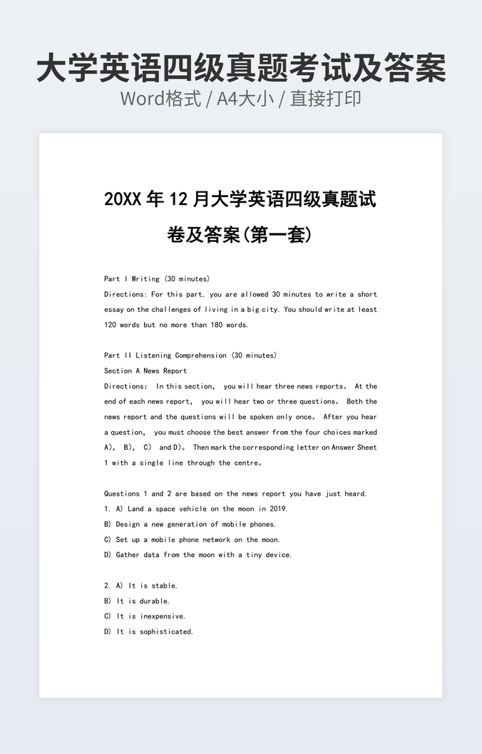 【特殊限制】设计师仅对作品中独创性部分享有著作权,对作品中含有的国旗、国徽等政治图案不享有权利,仅作为作品整体效果的示例展示,禁止商用。 相关关键词: 英语 六级考试 真题
