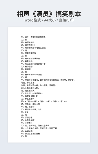【特殊限制】设计师仅对作品中独创性部分享有著作权,对作品中含有的国旗、国徽等政治图案不享有权利,仅作为作品整体效果的示例展示,禁止商用。 相关关键词: 祝酒词 相声 搞笑 剧本
