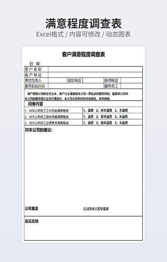 本作品内容为零售业调查问卷模板下载,大小为37.14KB,作品为高清大图模板,格式为xlsx, 属于满意度调查模板,作品模板源文件下载后可用编辑替换,模板中如有人物画像仅供参考禁止商用。小Q办公网-提供简历,PPT,Word,Excel优质模板素材下载模版平台,拥有海量的工作总结、竞聘求职、年终颁奖、计划书等。 通过小Q办公网下载满意度调查模板源文件编辑修改源文件文字和图片即可使用。