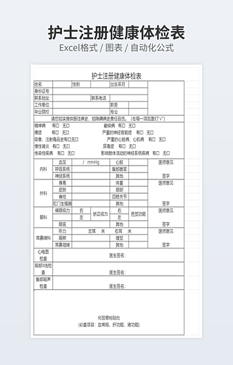 【特殊限制】设计师仅对作品中独创性部分享有著作权,对作品中含有的国旗、国徽等政治图案不享有权利,仅作为作品整体效果的示例展示,禁止商用。 相关关键词: 学校 医院 体检 表格 模板
