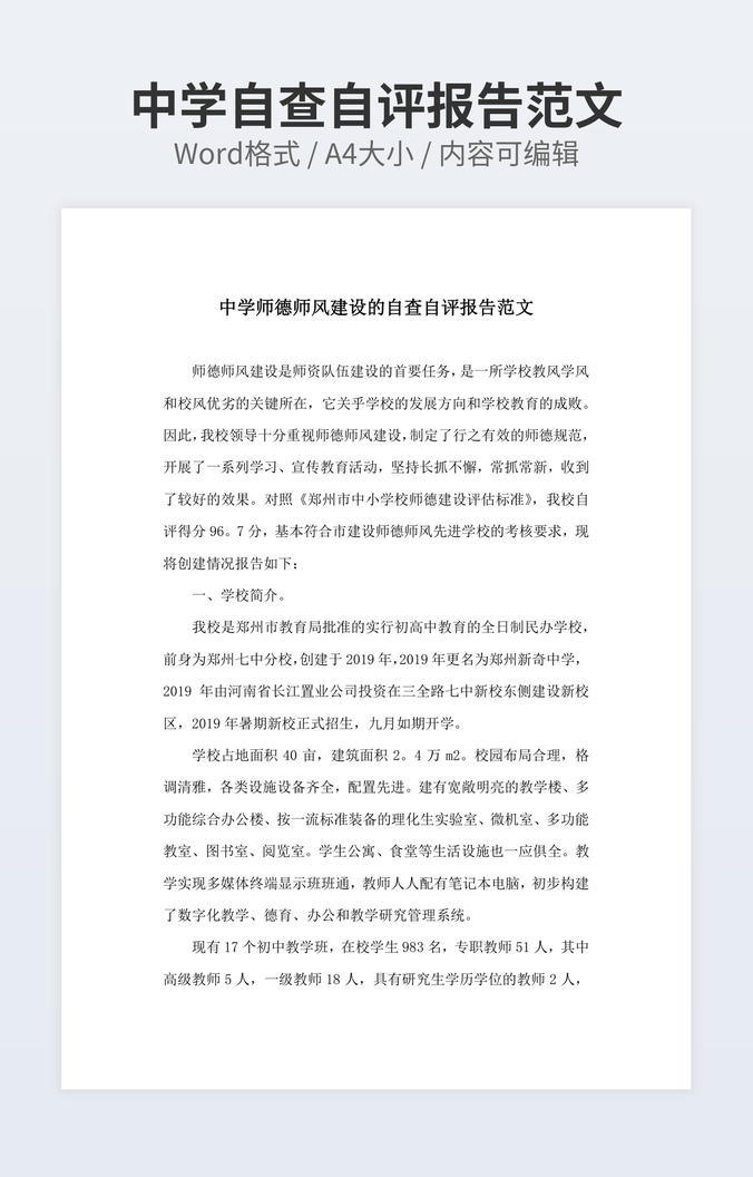 【特殊限制】设计师仅对作品中独创性部分享有著作权,对作品中含有的国旗、国徽等政治图案不享有权利,仅作为作品整体效果的示例展示,禁止商用。 相关关键词: 中学 体育 卫生 工作 自评 报告