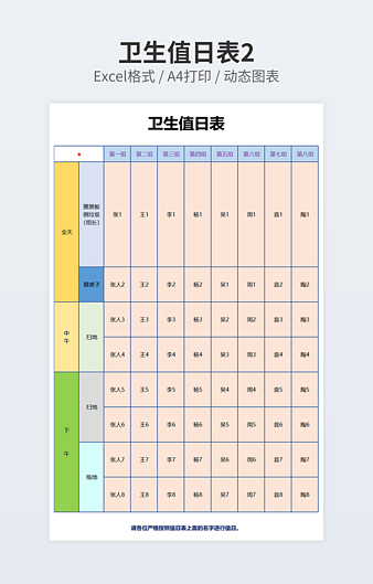 【特殊限制】设计师仅对作品中独创性部分享有著作权,对作品中含有的国旗、国徽等政治图案不享有权利,仅作为作品整体效果的示例展示,禁止商用。 相关关键词: 初中生 值日 日表