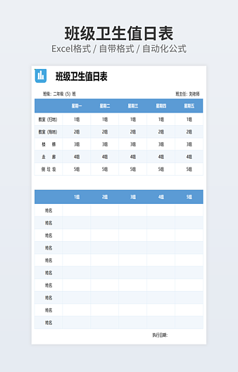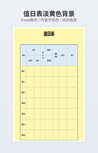 本作品内容为卫生值日表下载,大小为98KB,作品为高清大图模板,格式为xlsx, 属于学生值日表模板,作品模板源文件下载后可用编辑替换,模板中如有人物画像仅供参考禁止商用。小Q办公网-提供简历,PPT,Word,Excel优质模板素材下载模版平台,拥有海量的工作总结、竞聘求职、年终颁奖、计划书等。 通过小Q办公网下载学生值日表模板源文件编辑修改源文件文字和图片即可使用。