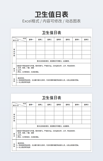 【特殊限制】设计师仅对作品中独创性部分享有著作权,对作品中含有的国旗、国徽等政治图案不享有权利,仅作为作品整体效果的示例展示,禁止商用。 相关关键词: 卫生 值日 日表