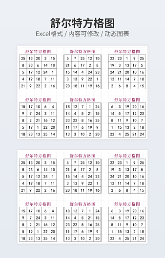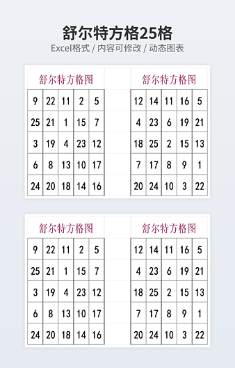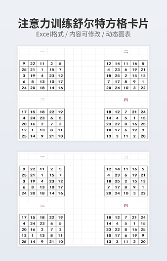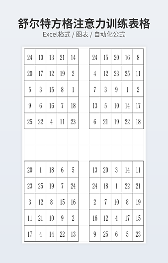 本作品内容为5阶舒尔特方格200张下载,大小为208.17KB,作品为高清大图模板,格式为xlsx, 属于舒尔特方格模板,作品模板源文件下载后可用编辑替换,模板中如有人物画像仅供参考禁止商用。小Q办公网-提供简历,PPT,Word,Excel优质模板素材下载模版平台,拥有海量的工作总结、竞聘求职、年终颁奖、计划书等。 通过小Q办公网下载舒尔特方格模板源文件编辑修改源文件文字和图片即可使用。