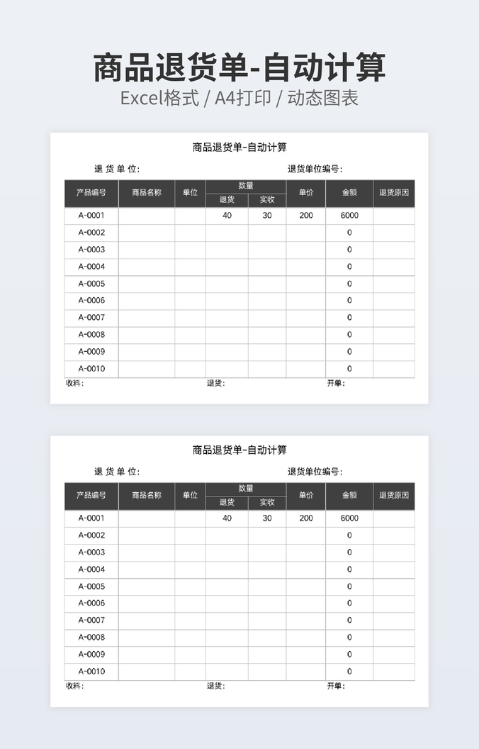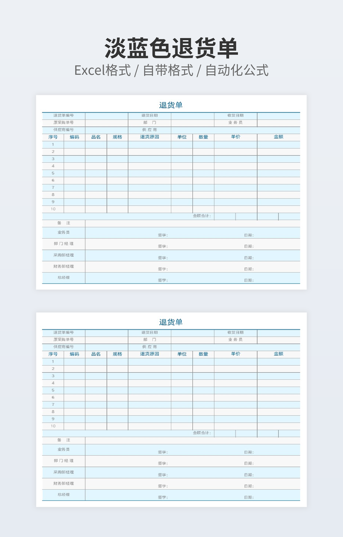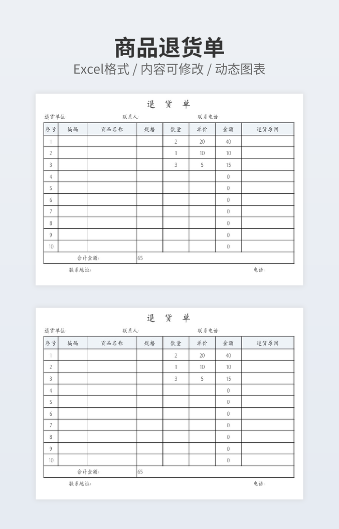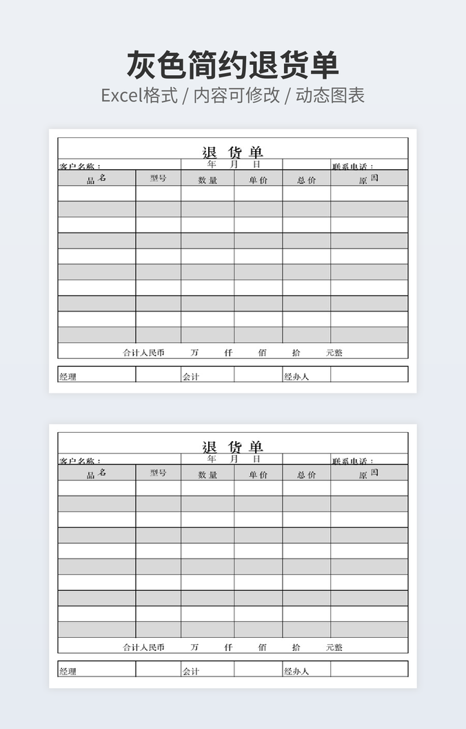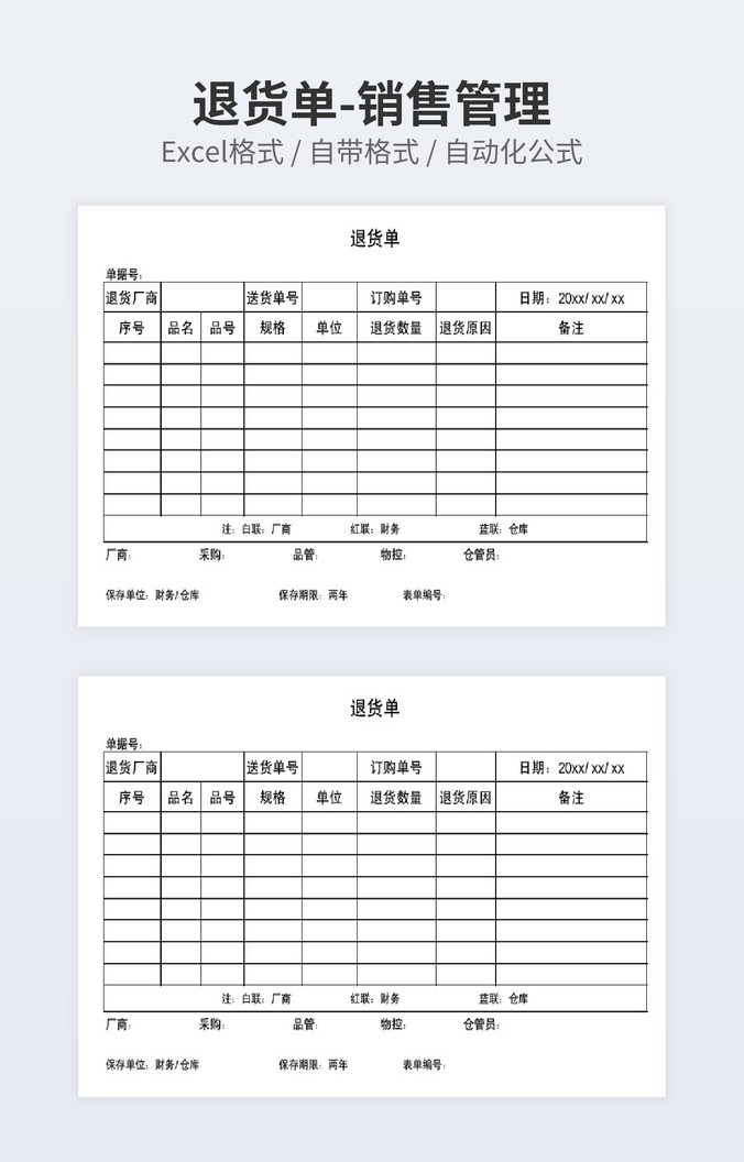 本作品内容为货物退货单下载,大小为16.56KB,作品为高清大图模板,格式为xlsx, 属于退货单模板,作品模板源文件下载后可用编辑替换,模板中如有人物画像仅供参考禁止商用。小Q办公网-提供简历,PPT,Word,Excel优质模板素材下载模版平台,拥有海量的工作总结、竞聘求职、年终颁奖、计划书等。 通过小Q办公网下载退货单模板源文件编辑修改源文件文字和图片即可使用。