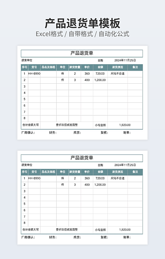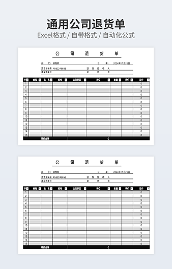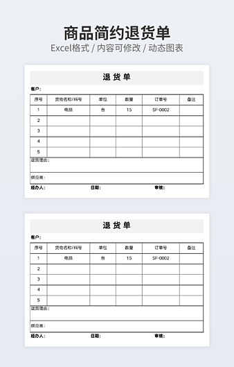 本作品内容为退货单-销售管理下载,大小为17.26KB,作品为高清大图模板,格式为xlsx, 属于退货单模板,作品模板源文件下载后可用编辑替换,模板中如有人物画像仅供参考禁止商用。小Q办公网-提供简历,PPT,Word,Excel优质模板素材下载模版平台,拥有海量的工作总结、竞聘求职、年终颁奖、计划书等。 通过小Q办公网下载退货单模板源文件编辑修改源文件文字和图片即可使用。