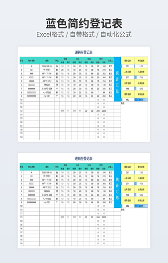 【特殊限制】设计师仅对作品中独创性部分享有著作权,对作品中含有的国旗、国徽等政治图案不享有权利,仅作为作品整体效果的示例展示,禁止商用。 相关关键词: 出入 入库 金额 淡蓝 蓝色 登记表