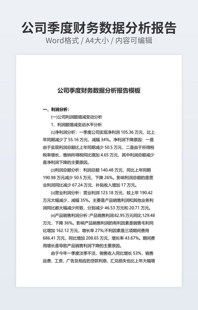本作品内容为简洁财务分析报告下载,大小为17.42KB,作品为高清大图模板,格式为docx, 属于财务分析模板,作品模板源文件下载后可用编辑替换,模板中如有人物画像仅供参考禁止商用。小Q办公网-提供简历,PPT,Word,Excel优质模板素材下载模版平台,拥有海量的工作总结、竞聘求职、年终颁奖、计划书等。 通过小Q办公网下载财务分析模板源文件编辑修改源文件文字和图片即可使用。