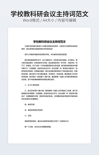 本作品内容为学校工作会议主持词范例下载,大小为18.35KB,作品为高清大图模板,格式为docx, 属于主持范文模板,作品模板源文件下载后可用编辑替换,模板中如有人物画像仅供参考禁止商用。小Q办公网-提供简历,PPT,Word,Excel优质模板素材下载模版平台,拥有海量的工作总结、竞聘求职、年终颁奖、计划书等。 通过小Q办公网下载主持范文模板源文件编辑修改源文件文字和图片即可使用。