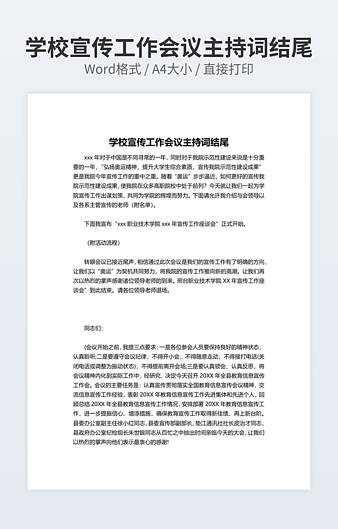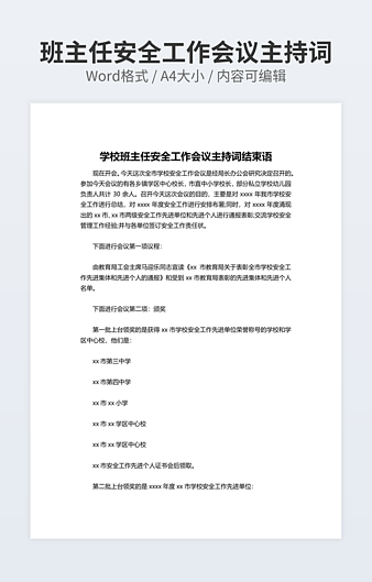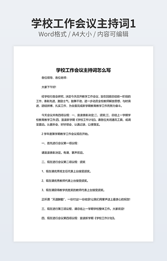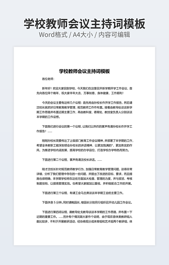 本作品内容为学校教师全体会议主持词下载,大小为16.18KB,作品为高清大图模板,格式为docx, 属于主持范文模板,作品模板源文件下载后可用编辑替换,模板中如有人物画像仅供参考禁止商用。小Q办公网-提供简历,PPT,Word,Excel优质模板素材下载模版平台,拥有海量的工作总结、竞聘求职、年终颁奖、计划书等。 通过小Q办公网下载主持范文模板源文件编辑修改源文件文字和图片即可使用。