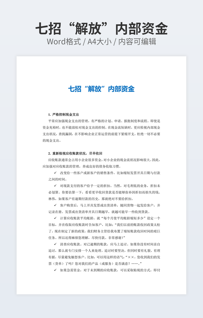 【特殊限制】设计师仅对作品中独创性部分享有著作权,对作品中含有的国旗、国徽等政治图案不享有权利,仅作为作品整体效果的示例展示,禁止商用。 相关关键词: 现金流 改善 方案 行动计划 清单