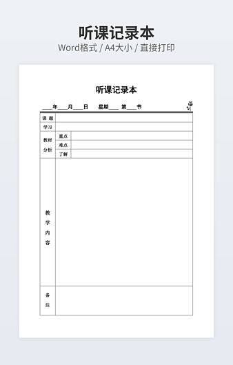 本作品内容为音乐课听课笔记下载,大小为14.46KB,作品为高清大图模板,格式为docx, 属于听课表模板,作品模板源文件下载后可用编辑替换,模板中如有人物画像仅供参考禁止商用。小Q办公网-提供简历,PPT,Word,Excel优质模板素材下载模版平台,拥有海量的工作总结、竞聘求职、年终颁奖、计划书等。 通过小Q办公网下载听课表模板源文件编辑修改源文件文字和图片即可使用。