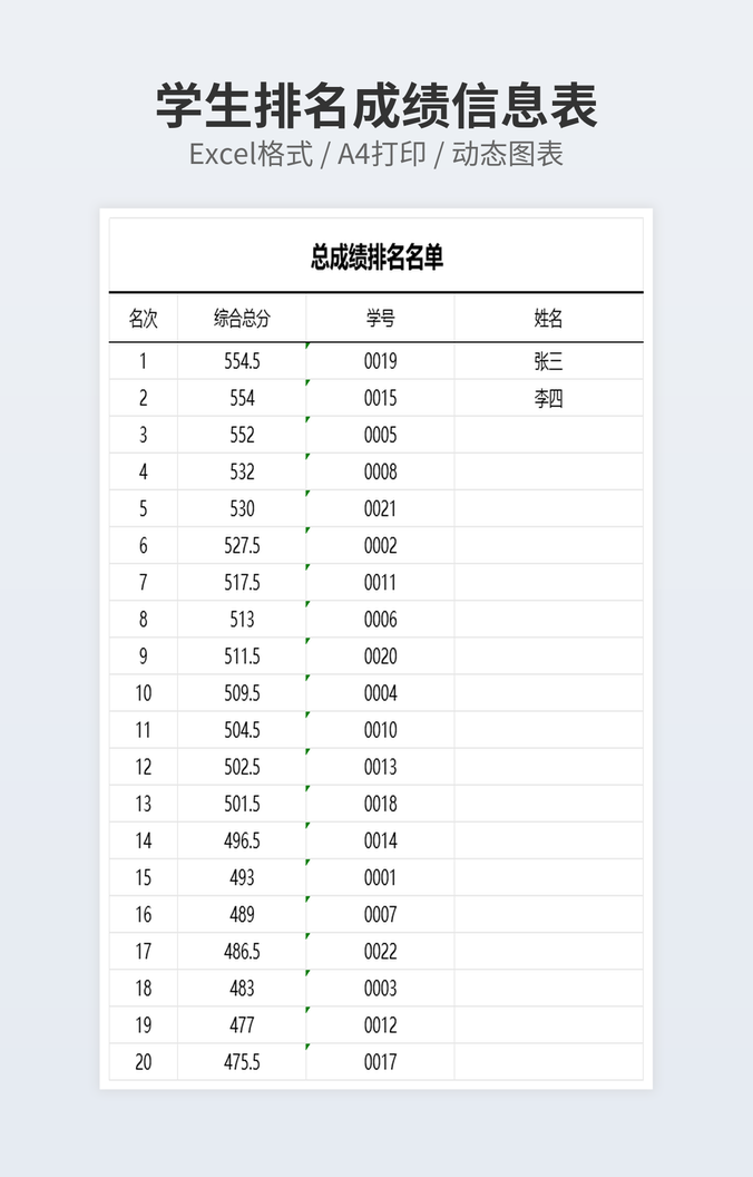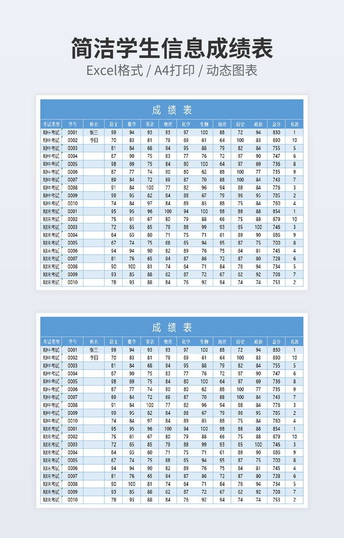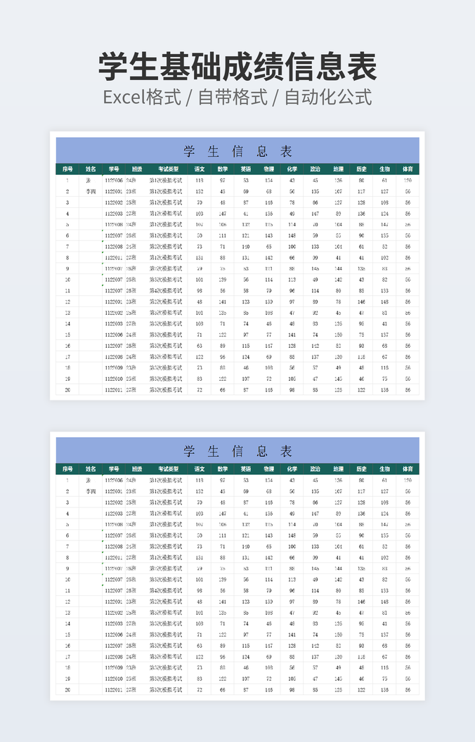 本作品内容为学生信息简洁成绩表下载,大小为136.11KB,作品为高清大图模板,格式为xlsx, 属于学生信息表模板,作品模板源文件下载后可用编辑替换,模板中如有人物画像仅供参考禁止商用。小Q办公网-提供简历,PPT,Word,Excel优质模板素材下载模版平台,拥有海量的工作总结、竞聘求职、年终颁奖、计划书等。 通过小Q办公网下载学生信息表模板源文件编辑修改源文件文字和图片即可使用。