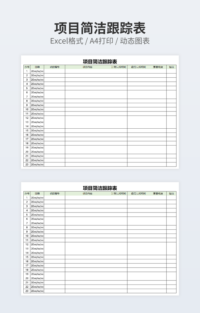 本作品内容为绿色项目计划追踪表下载,大小为12.45KB,作品为高清大图模板,格式为xlsx, 属于项目跟踪表模板,作品模板源文件下载后可用编辑替换,模板中如有人物画像仅供参考禁止商用。小Q办公网-提供简历,PPT,Word,Excel优质模板素材下载模版平台,拥有海量的工作总结、竞聘求职、年终颁奖、计划书等。 通过小Q办公网下载项目跟踪表模板源文件编辑修改源文件文字和图片即可使用。