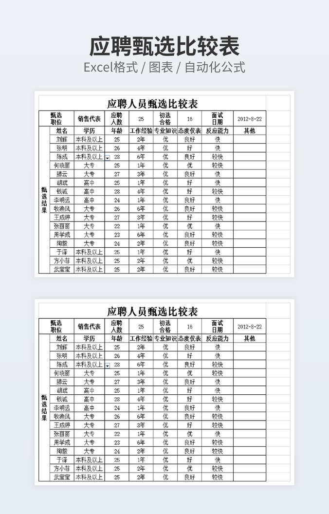 【特殊限制】设计师仅对作品中独创性部分享有著作权,对作品中含有的国旗、国徽等政治图案不享有权利,仅作为作品整体效果的示例展示,禁止商用。 相关关键词: 面试名单 面试人员 人员名单 面试表格 人员信息表 面试资料 名单模板 招聘面试 优秀