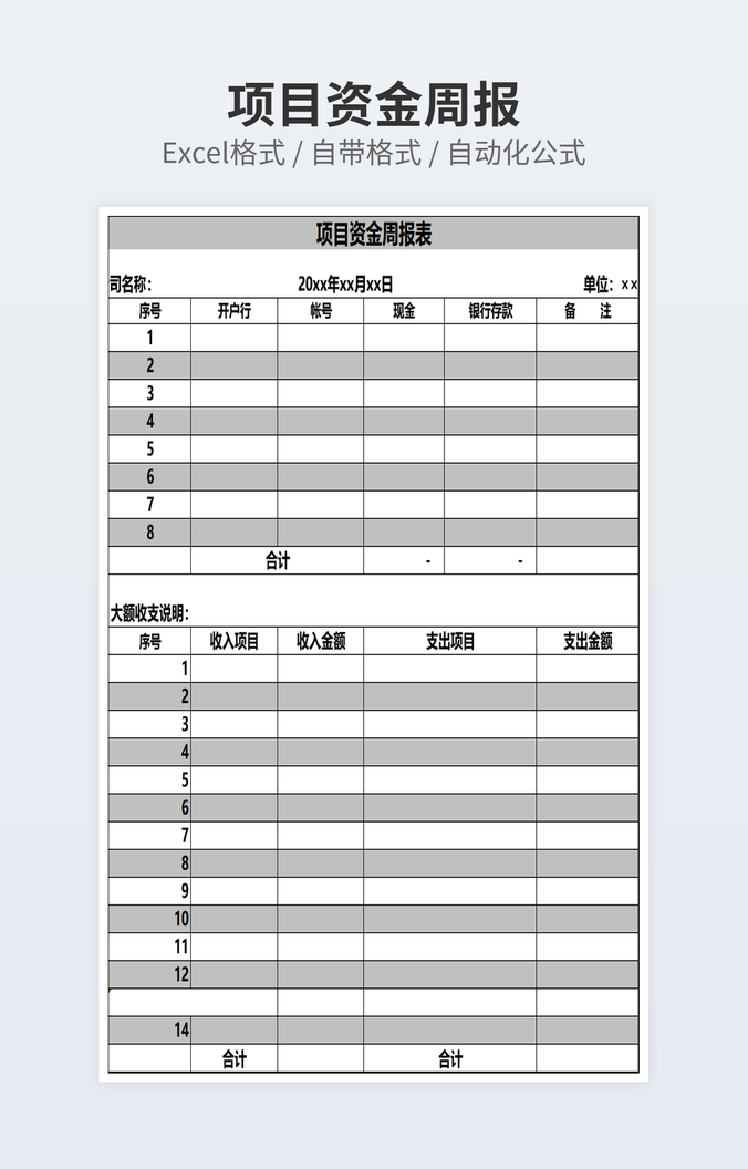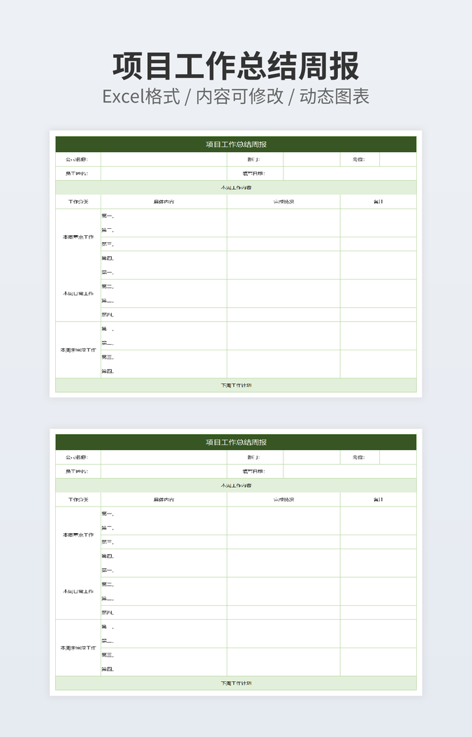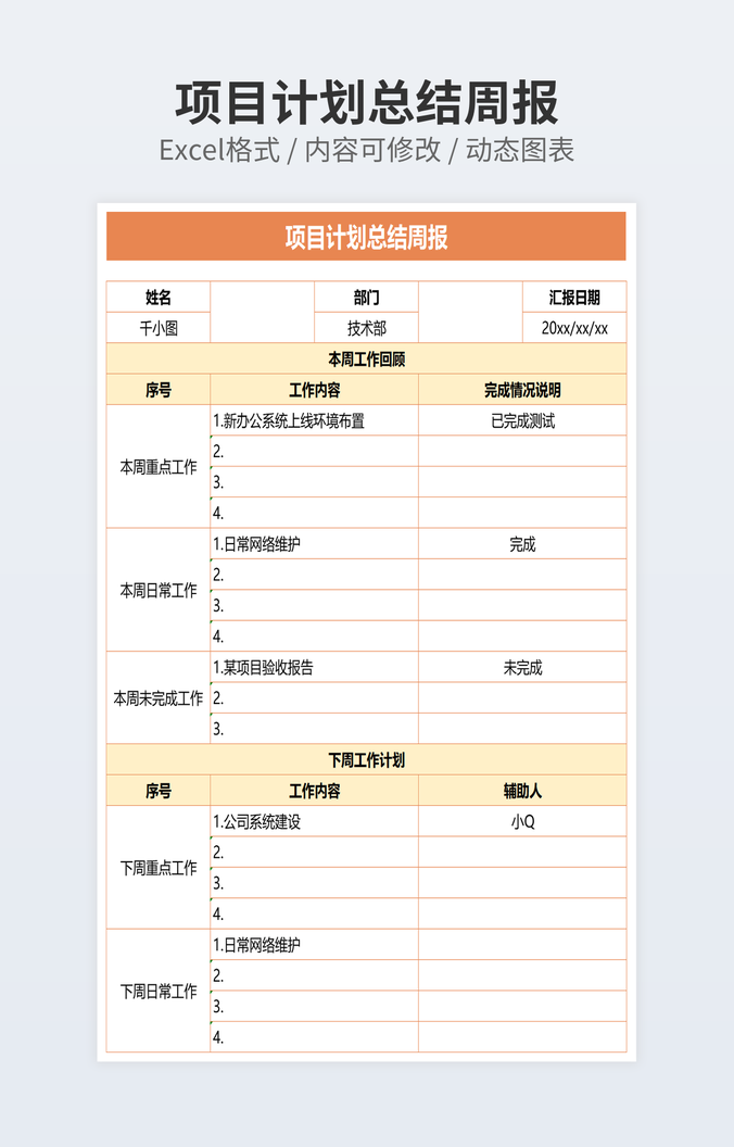 本作品内容为项目计划周报下载,大小为7.94KB,作品为高清大图模板,格式为xlsx, 属于项目周报模板,作品模板源文件下载后可用编辑替换,模板中如有人物画像仅供参考禁止商用。小Q办公网-提供简历,PPT,Word,Excel优质模板素材下载模版平台,拥有海量的工作总结、竞聘求职、年终颁奖、计划书等。 通过小Q办公网下载项目周报模板源文件编辑修改源文件文字和图片即可使用。