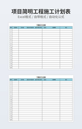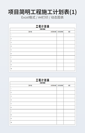 本作品内容为简洁项目工程施工计划表下载,大小为7.79KB,作品为高清大图模板,格式为xlsx, 属于工程施工计划表模板,作品模板源文件下载后可用编辑替换,模板中如有人物画像仅供参考禁止商用。小Q办公网-提供简历,PPT,Word,Excel优质模板素材下载模版平台,拥有海量的工作总结、竞聘求职、年终颁奖、计划书等。 通过小Q办公网下载工程施工计划表模板源文件编辑修改源文件文字和图片即可使用。