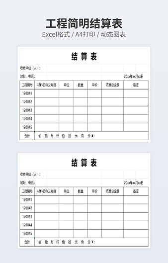 本作品内容为工程简约结算表下载,大小为8.59KB,作品为高清大图模板,格式为xlsx, 属于工程结算表模板,作品模板源文件下载后可用编辑替换,模板中如有人物画像仅供参考禁止商用。小Q办公网-提供简历,PPT,Word,Excel优质模板素材下载模版平台,拥有海量的工作总结、竞聘求职、年终颁奖、计划书等。 通过小Q办公网下载工程结算表模板源文件编辑修改源文件文字和图片即可使用。