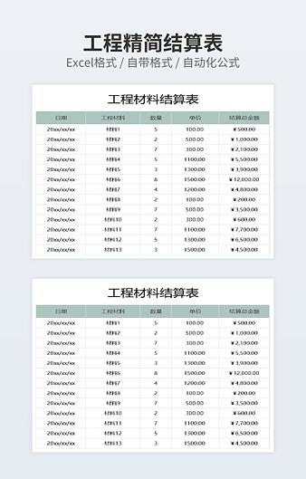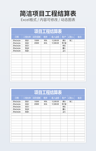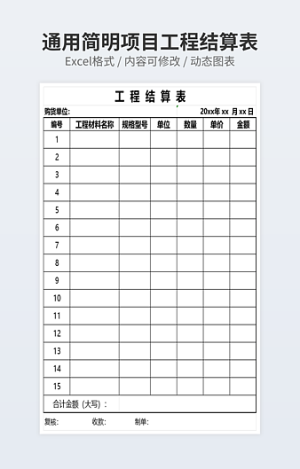 本作品内容为简洁淡蓝色工程结算表下载,大小为7.93KB,作品为高清大图模板,格式为xlsx, 属于工程结算表模板,作品模板源文件下载后可用编辑替换,模板中如有人物画像仅供参考禁止商用。小Q办公网-提供简历,PPT,Word,Excel优质模板素材下载模版平台,拥有海量的工作总结、竞聘求职、年终颁奖、计划书等。 通过小Q办公网下载工程结算表模板源文件编辑修改源文件文字和图片即可使用。