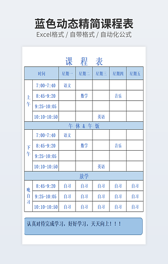 本作品内容为淡蓝色小学课程表下载,大小为11.5KB,作品为高清大图模板,格式为xlsx, 属于课程表模板,作品模板源文件下载后可用编辑替换,模板中如有人物画像仅供参考禁止商用。小Q办公网-提供简历,PPT,Word,Excel优质模板素材下载模版平台,拥有海量的工作总结、竞聘求职、年终颁奖、计划书等。 通过小Q办公网下载课程表模板源文件编辑修改源文件文字和图片即可使用。