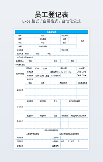 【特殊限制】设计师仅对作品中独创性部分享有著作权,对作品中含有的国旗、国徽等政治图案不享有权利,仅作为作品整体效果的示例展示,禁止商用。 相关关键词: 员工 入职 登记表 Excel 表格 超优秀