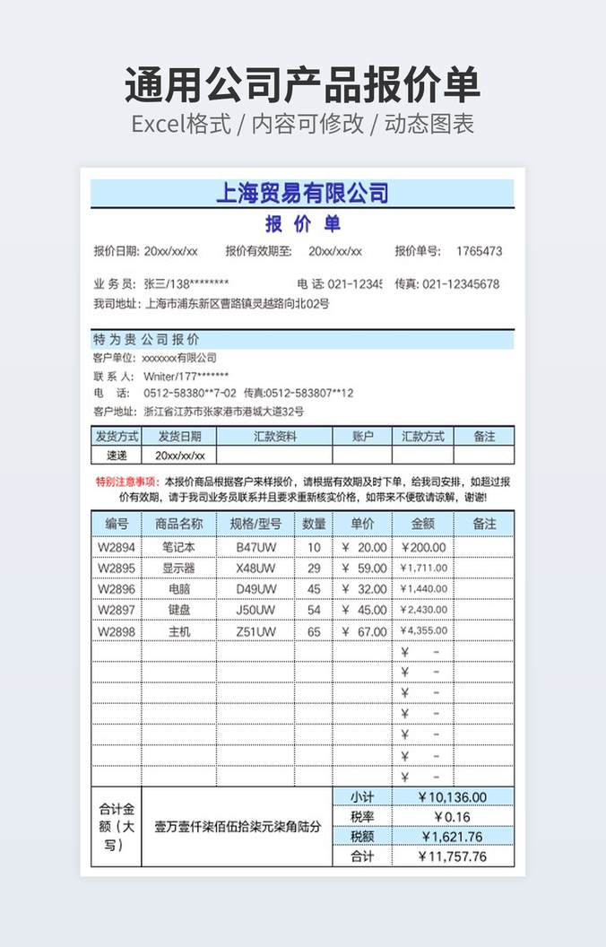 本作品内容为产品报价表(外贸通用报价表-报价单)下载,大小为454.9KB,作品为高清大图模板,格式为xlsx, 属于报价单模板,作品模板源文件下载后可用编辑替换,模板中如有人物画像仅供参考禁止商用。小Q办公网-提供简历,PPT,Word,Excel优质模板素材下载模版平台,拥有海量的工作总结、竞聘求职、年终颁奖、计划书等。 通过小Q办公网下载报价单模板源文件编辑修改源文件文字和图片即可使用。