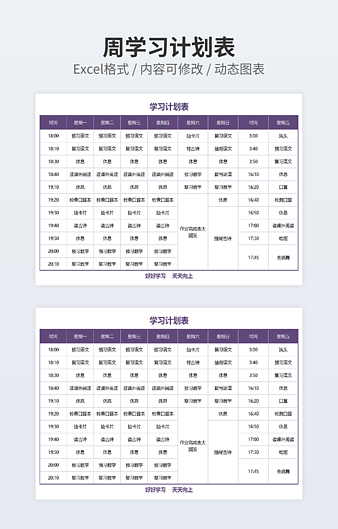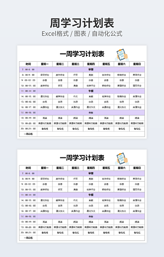【特殊限制】设计师仅对作品中独创性部分享有著作权,对作品中含有的国旗、国徽等政治图案不享有权利,仅作为作品整体效果的示例展示,禁止商用。 相关关键词: 一周 学习 学习计划 计划表 优秀