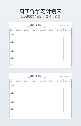 本作品内容为一周学习计划表下载,大小为15.02KB,作品为高清大图模板,格式为xlsx, 属于学习计划表模板,作品模板源文件下载后可用编辑替换,模板中如有人物画像仅供参考禁止商用。小Q办公网-提供简历,PPT,Word,Excel优质模板素材下载模版平台,拥有海量的工作总结、竞聘求职、年终颁奖、计划书等。 通过小Q办公网下载学习计划表模板源文件编辑修改源文件文字和图片即可使用。