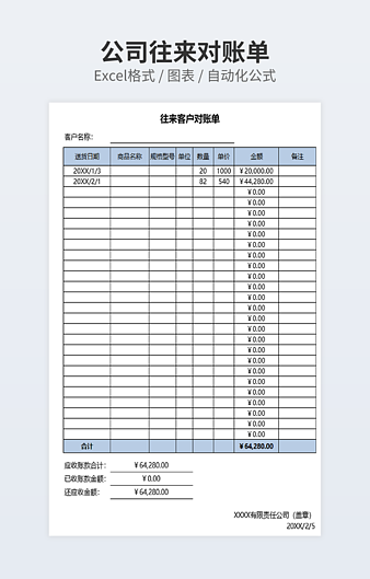 本作品内容为大气供应商对账单Excel表格模板下载,大小为13.88KB,作品为高清大图模板,格式为xlsx, 属于供应商管理模板,作品模板源文件下载后可用编辑替换,模板中如有人物画像仅供参考禁止商用。小Q办公网-提供简历,PPT,Word,Excel优质模板素材下载模版平台,拥有海量的工作总结、竞聘求职、年终颁奖、计划书等。 通过小Q办公网下载供应商管理模板源文件编辑修改源文件文字和图片即可使用。