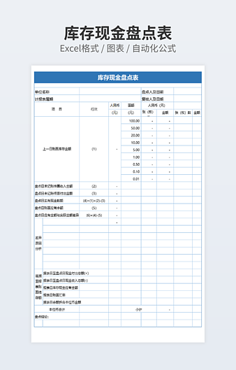 本作品内容为库存盘点现金下载,大小为11.65KB,作品为高清大图模板,格式为xlsx, 属于库存管理模板,作品模板源文件下载后可用编辑替换,模板中如有人物画像仅供参考禁止商用。小Q办公网-提供简历,PPT,Word,Excel优质模板素材下载模版平台,拥有海量的工作总结、竞聘求职、年终颁奖、计划书等。 通过小Q办公网下载库存管理模板源文件编辑修改源文件文字和图片即可使用。