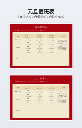 本作品内容为春节值班表下载,大小为16.44KB,作品为高清大图模板,格式为xlsx, 属于排班表模板,作品模板源文件下载后可用编辑替换,模板中如有人物画像仅供参考禁止商用。小Q办公网-提供简历,PPT,Word,Excel优质模板素材下载模版平台,拥有海量的工作总结、竞聘求职、年终颁奖、计划书等。 通过小Q办公网下载排班表模板源文件编辑修改源文件文字和图片即可使用。