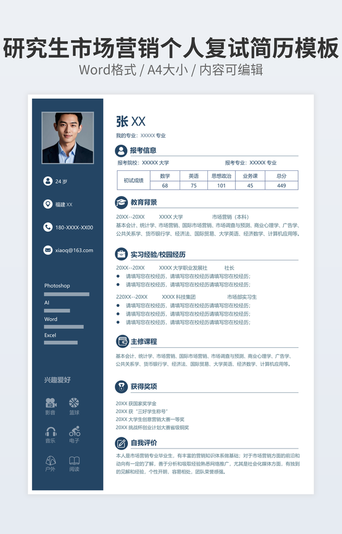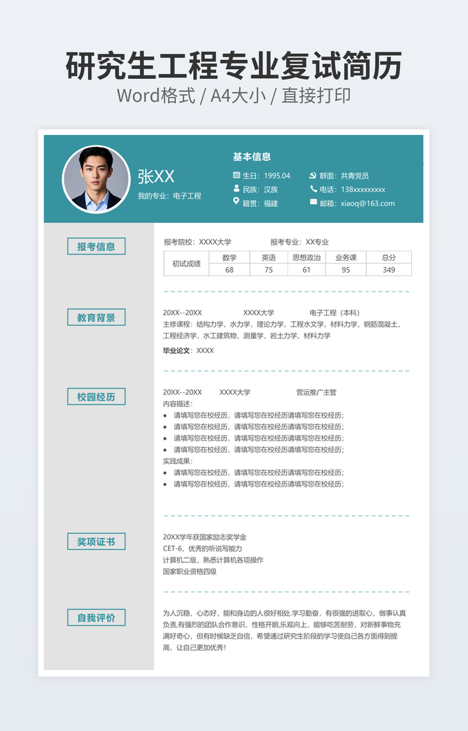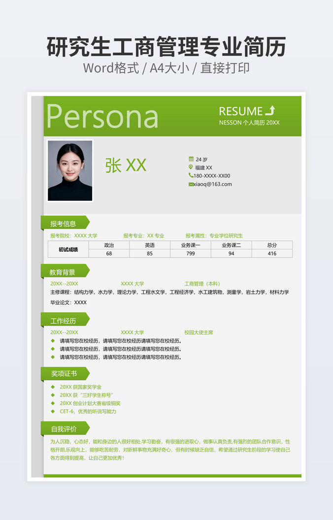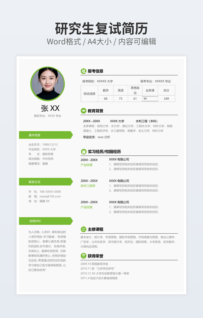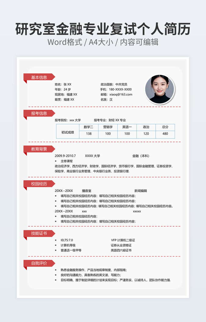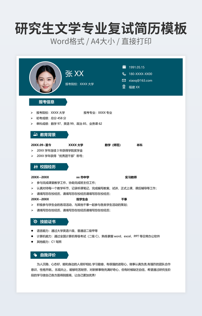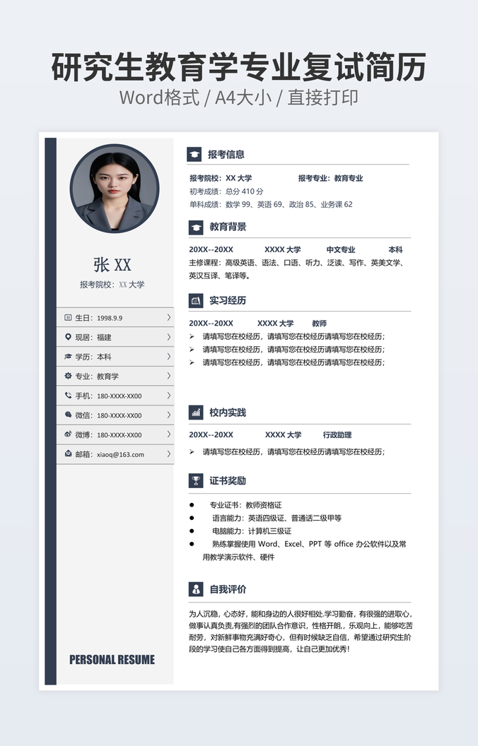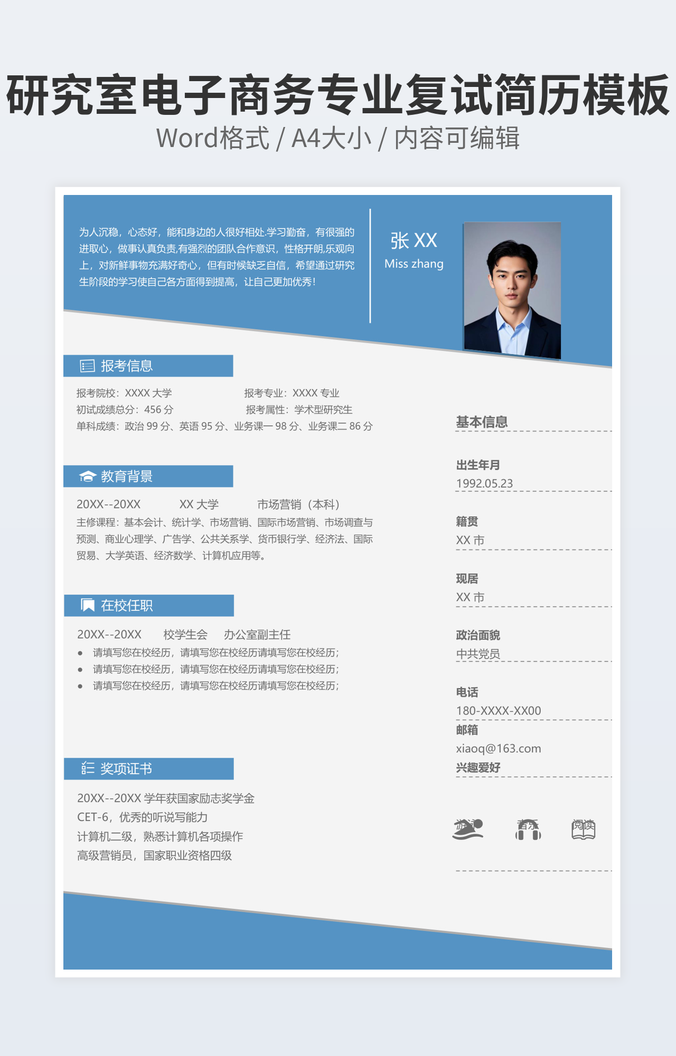 本作品内容为研究生信息管理专业复试简历模板下载,大小为85.22KB,作品为高清大图模板,格式为docx, 属于研究生模板,作品模板源文件下载后可用编辑替换,模板中如有人物画像仅供参考禁止商用。小Q办公网-提供简历,PPT,Word,Excel优质模板素材下载模版平台,拥有海量的工作总结、竞聘求职、年终颁奖、计划书等。 通过小Q办公网下载研究生模板源文件编辑修改源文件文字和图片即可使用。