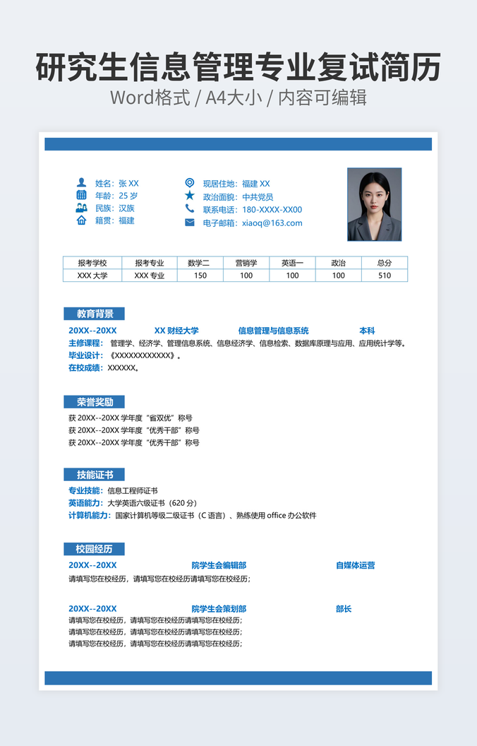 【特殊限制】设计师仅对作品中独创性部分享有著作权,对作品中含有的国旗、国徽等政治图案不享有权利,仅作为作品整体效果的示例展示,禁止商用。 相关关键词: 研究生 信息管理 专业 复试 简历 模板