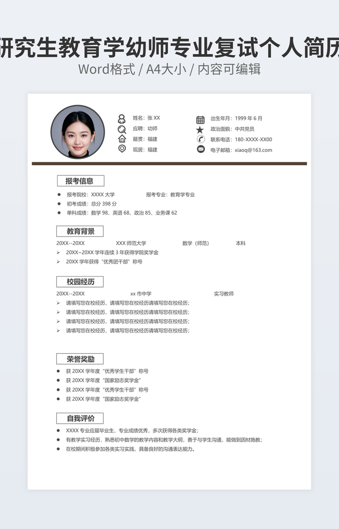 本作品内容为研究生管理学专业复试简历下载,大小为73.61KB,作品为高清大图模板,格式为docx, 属于研究生模板,作品模板源文件下载后可用编辑替换,模板中如有人物画像仅供参考禁止商用。小Q办公网-提供简历,PPT,Word,Excel优质模板素材下载模版平台,拥有海量的工作总结、竞聘求职、年终颁奖、计划书等。 通过小Q办公网下载研究生模板源文件编辑修改源文件文字和图片即可使用。
