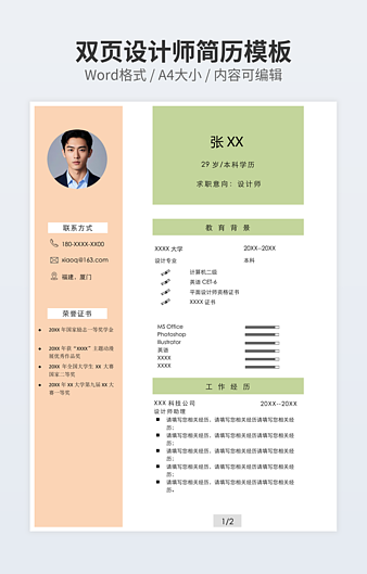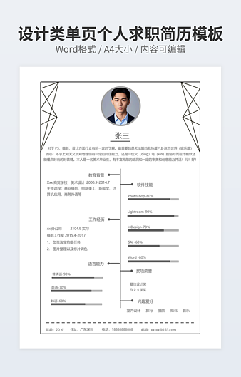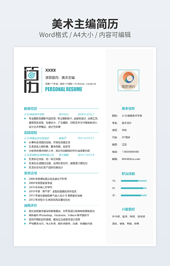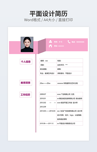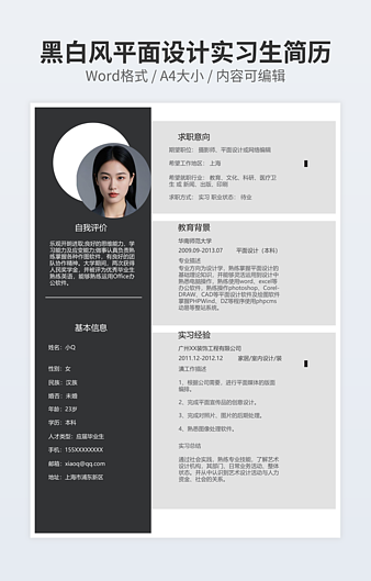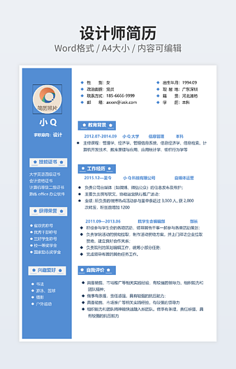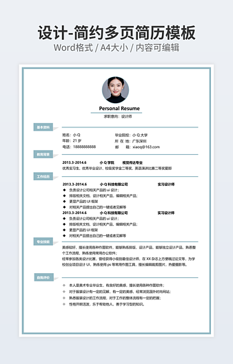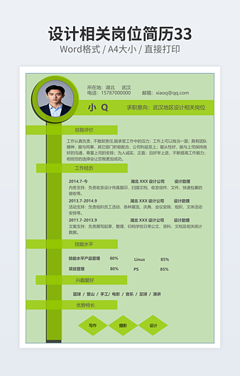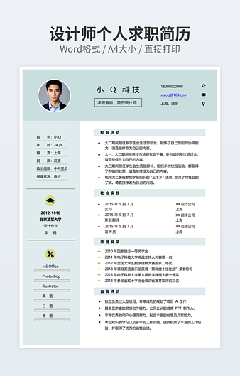 本作品内容为产品设计师简历下载,大小为43.3KB,作品为高清大图模板,格式为docx, 属于设计相关模板,作品模板源文件下载后可用编辑替换,模板中如有人物画像仅供参考禁止商用。小Q办公网-提供简历,PPT,Word,Excel优质模板素材下载模版平台,拥有海量的工作总结、竞聘求职、年终颁奖、计划书等。 通过小Q办公网下载设计相关模板源文件编辑修改源文件文字和图片即可使用。