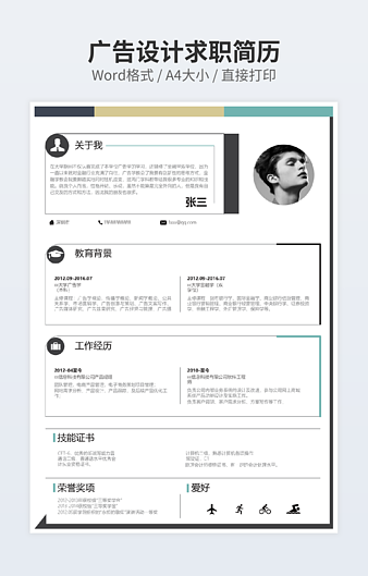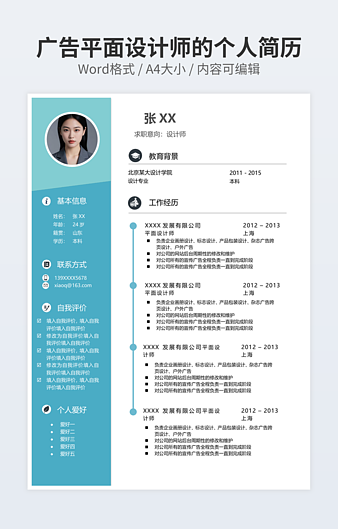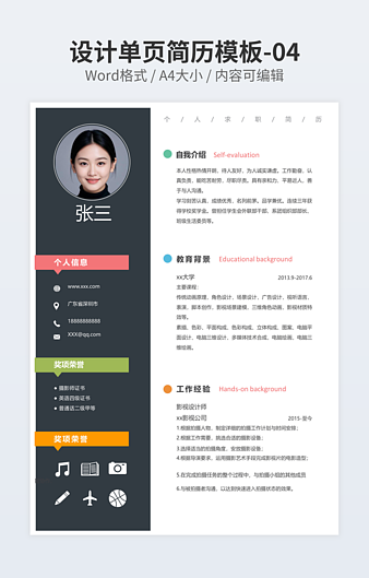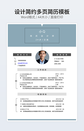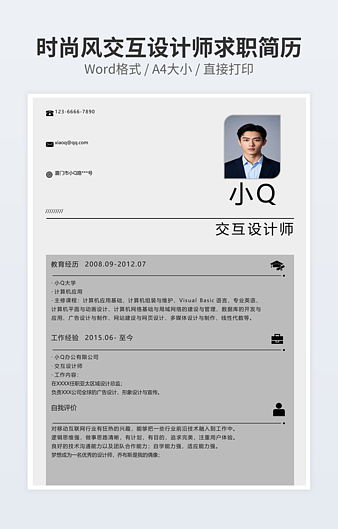 本作品内容为产品设计求职简历下载,大小为153.17KB,作品为高清大图模板,格式为docx, 属于设计相关模板,作品模板源文件下载后可用编辑替换,模板中如有人物画像仅供参考禁止商用。小Q办公网-提供简历,PPT,Word,Excel优质模板素材下载模版平台,拥有海量的工作总结、竞聘求职、年终颁奖、计划书等。 通过小Q办公网下载设计相关模板源文件编辑修改源文件文字和图片即可使用。