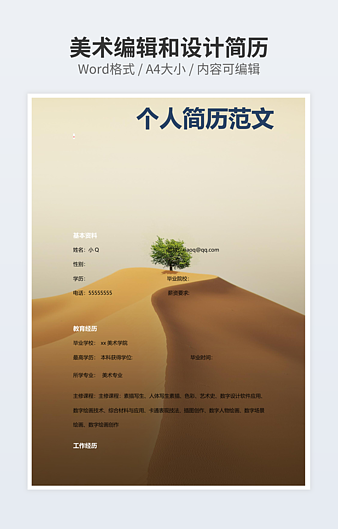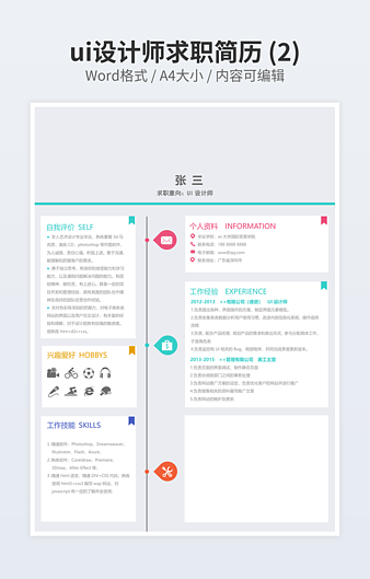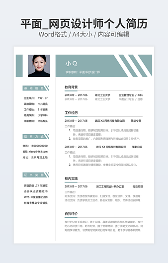 本作品内容为平面设计个人简历模板下载,大小为715.44KB,作品为高清大图模板,格式为docx, 属于设计相关模板,作品模板源文件下载后可用编辑替换,模板中如有人物画像仅供参考禁止商用。小Q办公网-提供简历,PPT,Word,Excel优质模板素材下载模版平台,拥有海量的工作总结、竞聘求职、年终颁奖、计划书等。 通过小Q办公网下载设计相关模板源文件编辑修改源文件文字和图片即可使用。