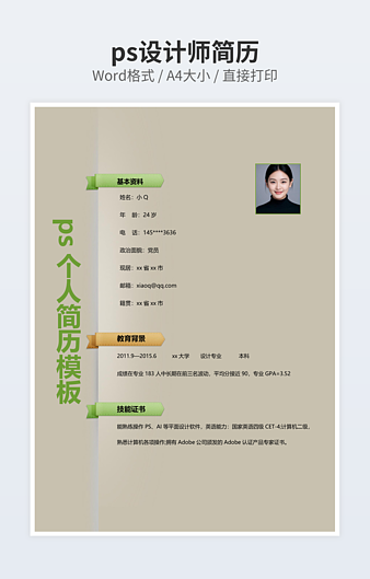 本作品内容为平面设计简历免费下载下载,大小为136.85KB,作品为高清大图模板,格式为docx, 属于设计相关模板,作品模板源文件下载后可用编辑替换,模板中如有人物画像仅供参考禁止商用。小Q办公网-提供简历,PPT,Word,Excel优质模板素材下载模版平台,拥有海量的工作总结、竞聘求职、年终颁奖、计划书等。 通过小Q办公网下载设计相关模板源文件编辑修改源文件文字和图片即可使用。