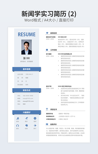 【特殊限制】设计师仅对作品中独创性部分享有著作权,对作品中含有的国旗、国徽等政治图案不享有权利,仅作为作品整体效果的示例展示,禁止商用。 相关关键词: 国际 经济 贸易 专业 简历