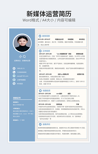 本作品内容为国际贸易个人简历下载,大小为74.63KB,作品为高清大图模板,格式为docx, 属于其他模板,作品模板源文件下载后可用编辑替换,模板中如有人物画像仅供参考禁止商用。小Q办公网-提供简历,PPT,Word,Excel优质模板素材下载模版平台,拥有海量的工作总结、竞聘求职、年终颁奖、计划书等。 通过小Q办公网下载其他模板源文件编辑修改源文件文字和图片即可使用。