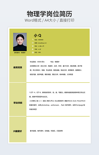 【特殊限制】设计师仅对作品中独创性部分享有著作权,对作品中含有的国旗、国徽等政治图案不享有权利,仅作为作品整体效果的示例展示,禁止商用。 相关关键词: 研究生 考生 个人简历