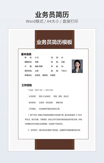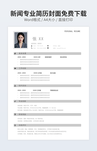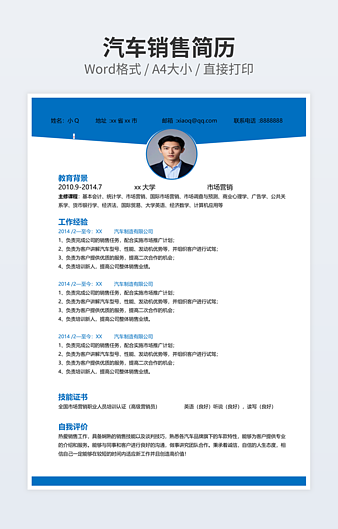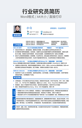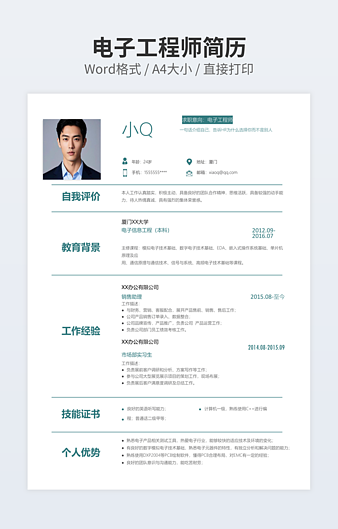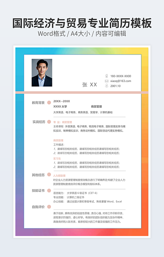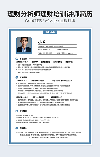 本作品内容为经济管理类简历设计下载,大小为31.13KB,作品为高清大图模板,格式为docx, 属于其他模板,作品模板源文件下载后可用编辑替换,模板中如有人物画像仅供参考禁止商用。小Q办公网-提供简历,PPT,Word,Excel优质模板素材下载模版平台,拥有海量的工作总结、竞聘求职、年终颁奖、计划书等。 通过小Q办公网下载其他模板源文件编辑修改源文件文字和图片即可使用。