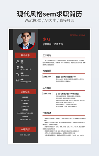本作品内容为美术专业个人简历模板下载,大小为105.77KB,作品为高清大图模板,格式为docx, 属于其他模板,作品模板源文件下载后可用编辑替换,模板中如有人物画像仅供参考禁止商用。小Q办公网-提供简历,PPT,Word,Excel优质模板素材下载模版平台,拥有海量的工作总结、竞聘求职、年终颁奖、计划书等。 通过小Q办公网下载其他模板源文件编辑修改源文件文字和图片即可使用。