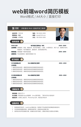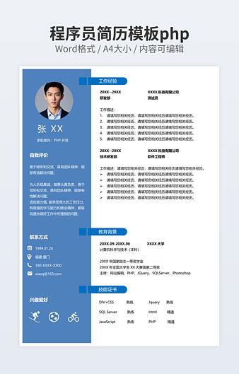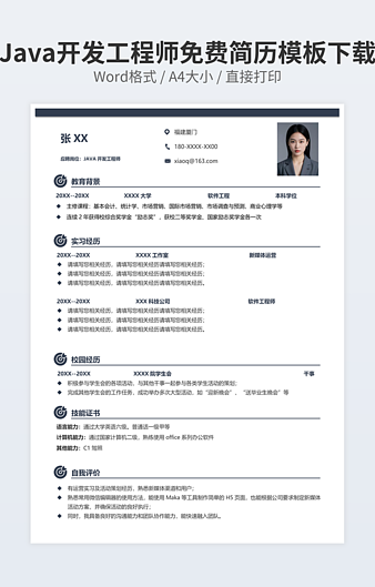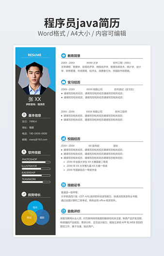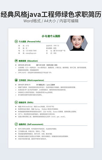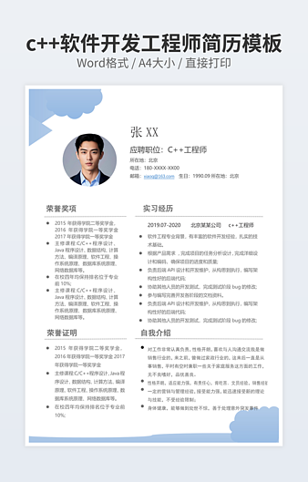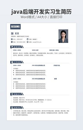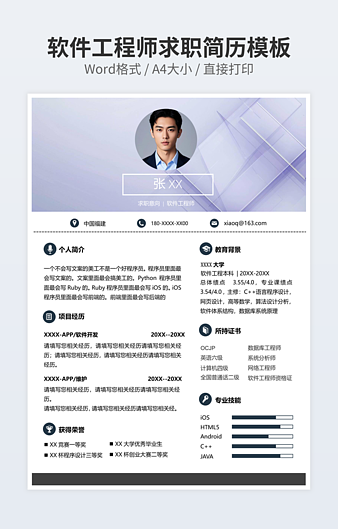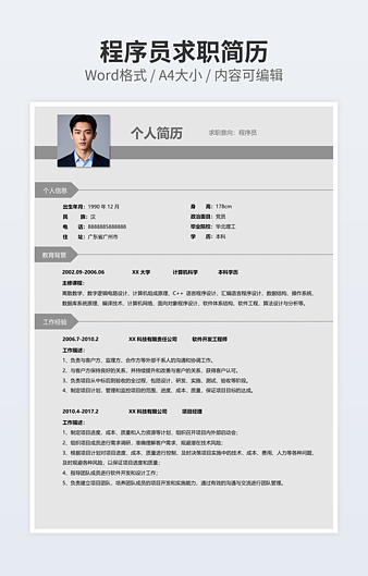 本作品内容为计算机科学与技术求职简历模板下载,大小为125.61KB,作品为高清大图模板,格式为docx, 属于程序员模板,作品模板源文件下载后可用编辑替换,模板中如有人物画像仅供参考禁止商用。小Q办公网-提供简历,PPT,Word,Excel优质模板素材下载模版平台,拥有海量的工作总结、竞聘求职、年终颁奖、计划书等。 通过小Q办公网下载程序员模板源文件编辑修改源文件文字和图片即可使用。
