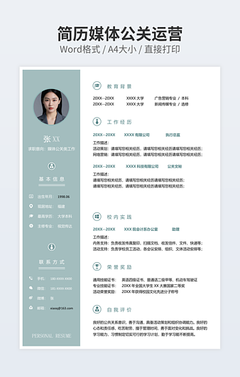 本作品内容为商务管理类简历设计下载,大小为122.77KB,作品为高清大图模板,格式为docx, 属于产品运营模板,作品模板源文件下载后可用编辑替换,模板中如有人物画像仅供参考禁止商用。小Q办公网-提供简历,PPT,Word,Excel优质模板素材下载模版平台,拥有海量的工作总结、竞聘求职、年终颁奖、计划书等。 通过小Q办公网下载产品运营模板源文件编辑修改源文件文字和图片即可使用。